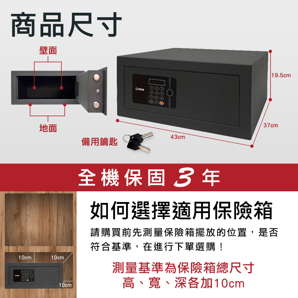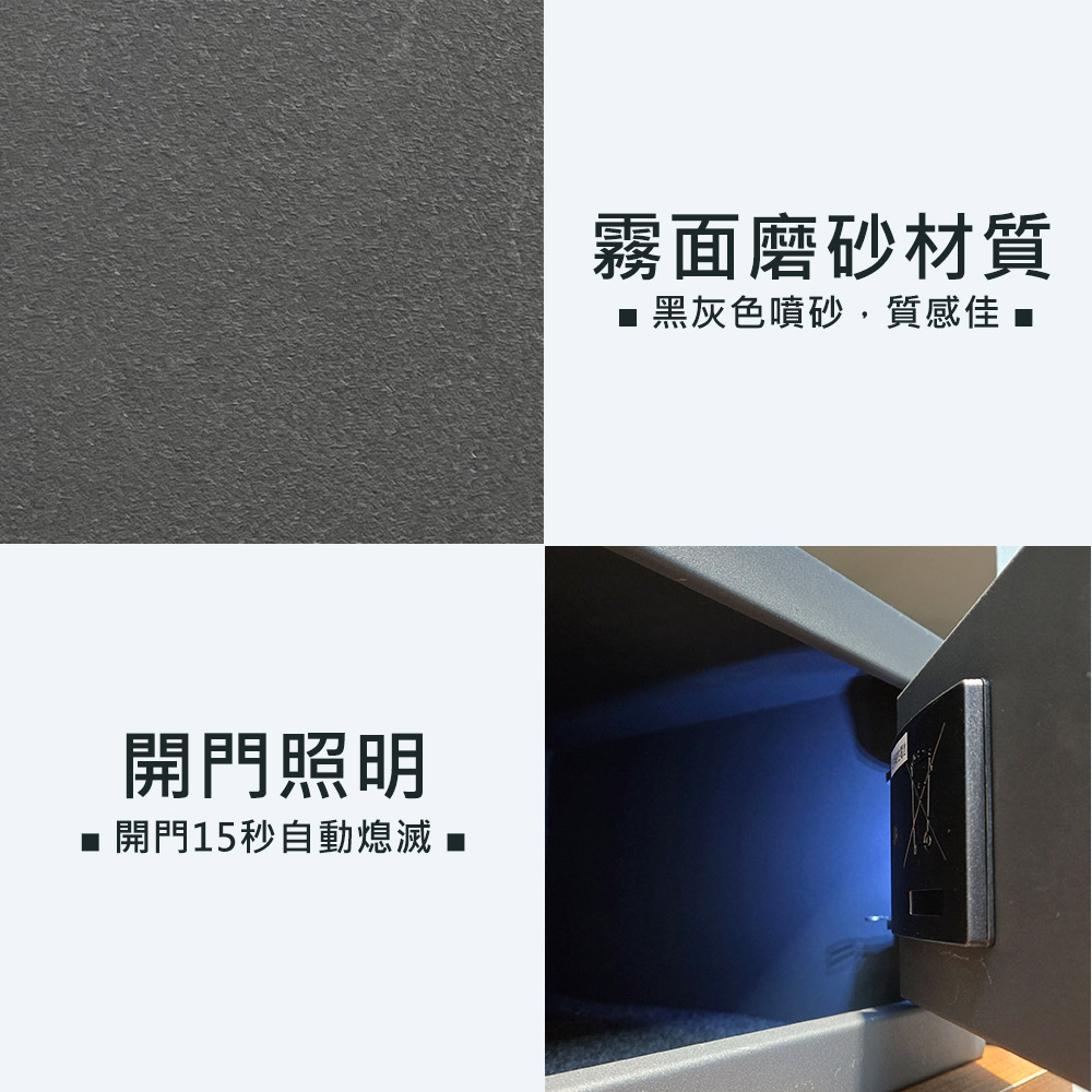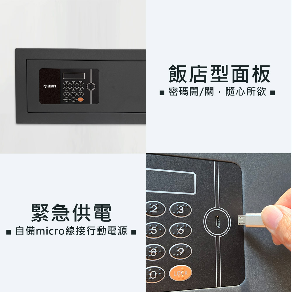 飯店型保險箱結合了簡約美學與直覺式密碼管理,採用4-6位數「密碼開、密碼關」設計,箱體採用黑灰色精緻噴霧工藝處理,不易沾染指紋。其外尺寸為(高)19.5x(寬)43x(深)37cm公分,低扁平的長方體設計,不僅節省空間,更能輕鬆置入系統衣櫃或層架中;內層寬度達42 公分,足以存放15吋筆記型電腦、單眼相機或重要文書資料。防護結構紮實,門板厚度達 4mm,搭配 1.5mm 的強化箱體,整體重量約 10kg,在確保防盜強度的同時,也兼具安裝的靈活性。面板下方設有隱藏式緊急鑰匙孔,更配備了外部緊急充電口,即便內部電池沒電,也能即時供電解除危機。
