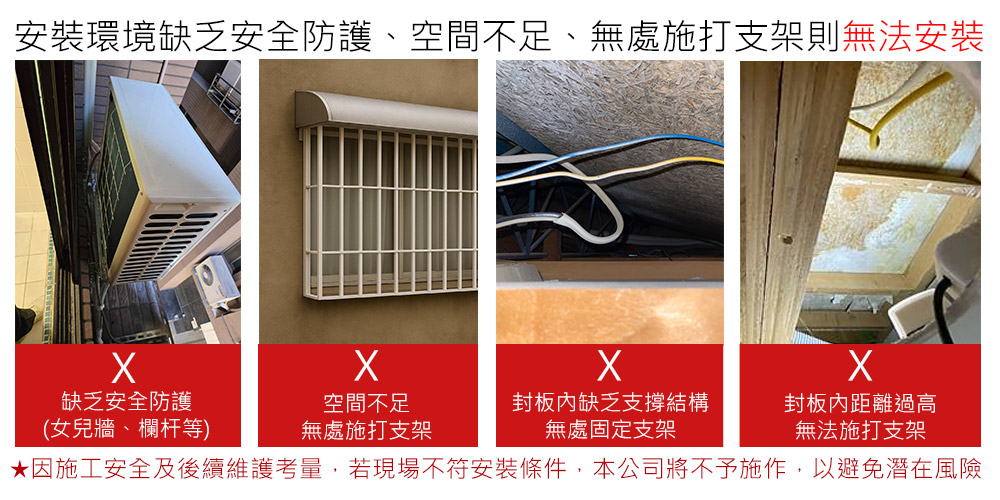 若安裝現場 缺乏必要的安全設施(如女兒牆、防墜護欄、安全樓梯等),為保障您與技師的安全,本公司不建議進行產品安裝作業。